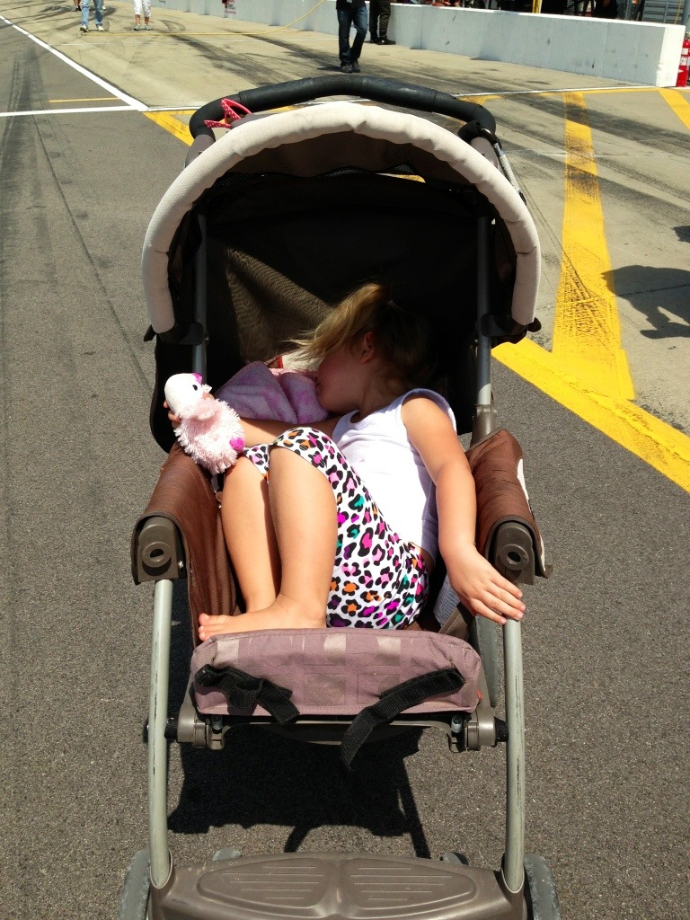 We all ran back up to the grandstand to get out seats for the final race. These cars roared really loud as they went by. Roz was still loving the cars and the noise. She would clap at all the cars as they flew by at 190mph. The racing was awesome. There were great battles in both Daytona Prototype and GT. The battle for Prototype lasted the entire race and was really close on the last lap. It was a great ending to the perfect family day. Roz couldn’t quite handle all the excitement during the final race. Haha.