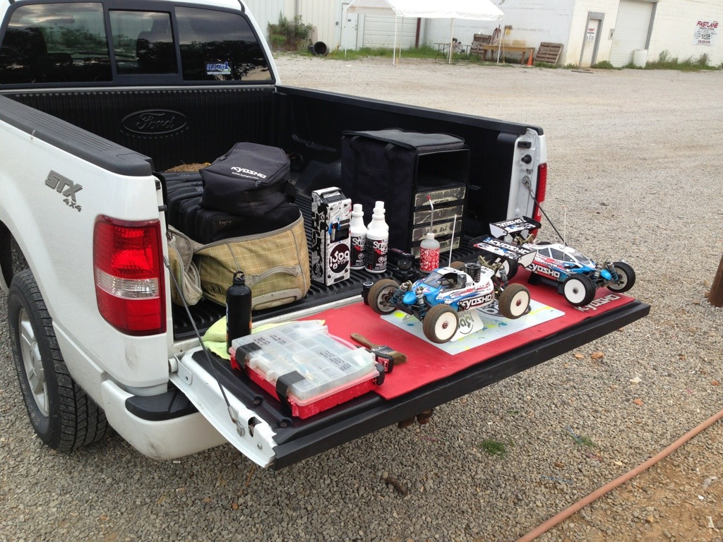 I get my greatest peaceful moments when I get out to the track before Chuck is in the hobby store. I bust out my tailgate pit setup and hit the track. Gotta love it. Haha. It’s really not too bad, I just need to build in a Kyosho canopy and I’d be completely legit!!!