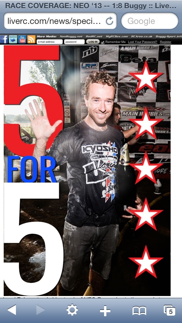 Then it was semi practice. It was much warmer outside today and you could actually see blue sky. I thought they had some weird sky in England. I thought it was only grey or something, but I was wrong, England does in fact have a blue sky. My car felt ok, but I was crashing like crazy. My car felt too soft. I wasn’t worried though. I went up on my shock oil and added a touch of camber to my car for the semi. I bolted on a new set of AKA Super Soft Impacts, and it was race time. I had a flawless semi. Not getting off line or making one mistake the entire 20 minutes. I won my semi by 25 seconds. It felt awesome to be clean for the whole race. Boots won his semi, but he was 14 seconds slower than mine. I didn’t make any changes to my car for the final. I started on TQ for the final and led every lap to take the win. It was amazing. I have had some bad luck lately and I was soooooooooooooo happy to work hard, drive good, and get the result. I can’t believe that I’m 5 for 5!!!!!!!