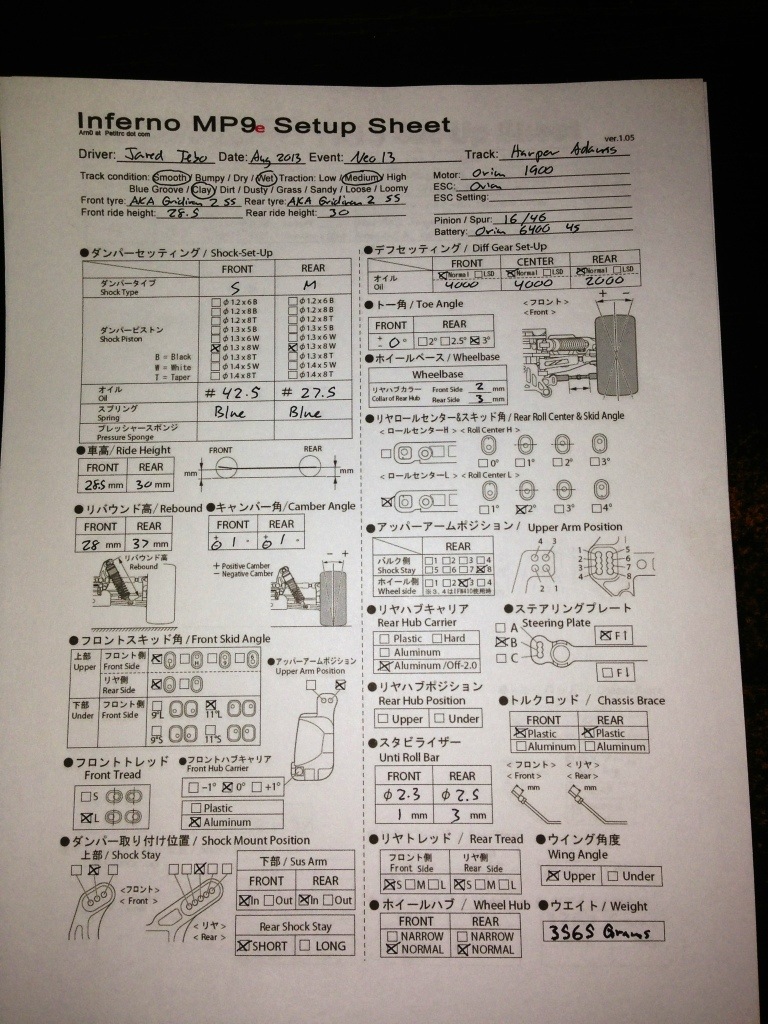 3. Congratulation DNC 🙂 Awsome Job …… JT What does it mean on set up sheet On MP9 E Tki where it says shock Type ? Says a for Front has a S and rear has a M is that the shock ends size ? And when are posting new set up you used at DNC. Thanks Tebo and keep riding your road bike gets the stress out Thanks take care
