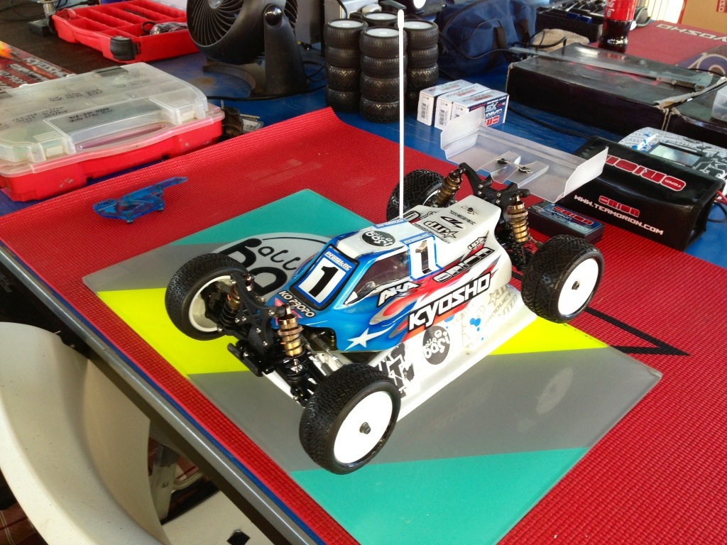 4wd practice was a mentally tough day. We had 10, 5 minute practice sessions, and I only finished 3 of them. I had really weird issues all day long, but my car had signs of promise here and there. We stayed up late together (my 4wd and I) and we talked it out, today is gonna be ok. Even though I only did 1 lap for the seeding run, they seeded me in the final qualifier. They have a rule if you break, they can use knowledge of the driver to seed them. Now I just need to put yesterday behind me. Here is a pic of my car for P1.