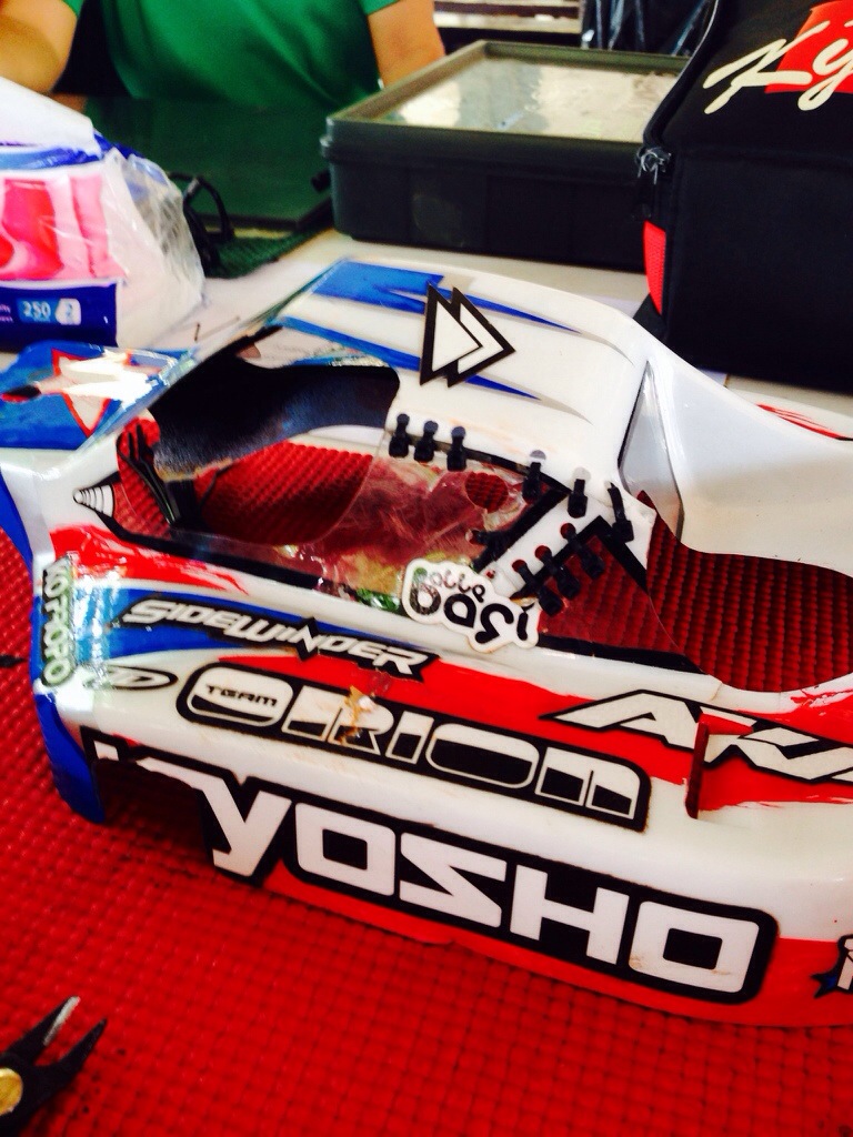 Got my engine all tuned and I was ready to hit the track. I just didn’t want to look like a fool on my first lap. I did 100s of mental laps, and it must have helped. My first run was not too bad. I felt pretty comfortable and it was really enjoyable. Unfortunately I had a weird crash; I traction rolled in a fast section and slide upside down into a pipe. The pipes are held in with these sticks and I think a stick went into the body where the fuel tank is. It just about ripped the roof off my body and it snapped the top end needle off the carb. I only brought 1 body with me, so I did a Frankenstein job on it.