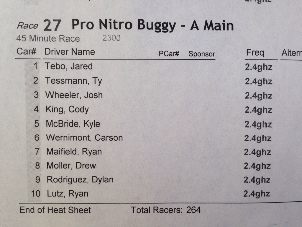 Ebuggy again was really rough. Not really sure what the issue is, I just don’t feel comfortable out there. I have the same exact setup as my nitro car, but they don’t feel the same. I feel like the bumps are twice as big with my electric buggy. Maybe the weight difference in the cars. I crashed my brains out and got maybe 9th or so for the round. I’ll start 8th in the main.