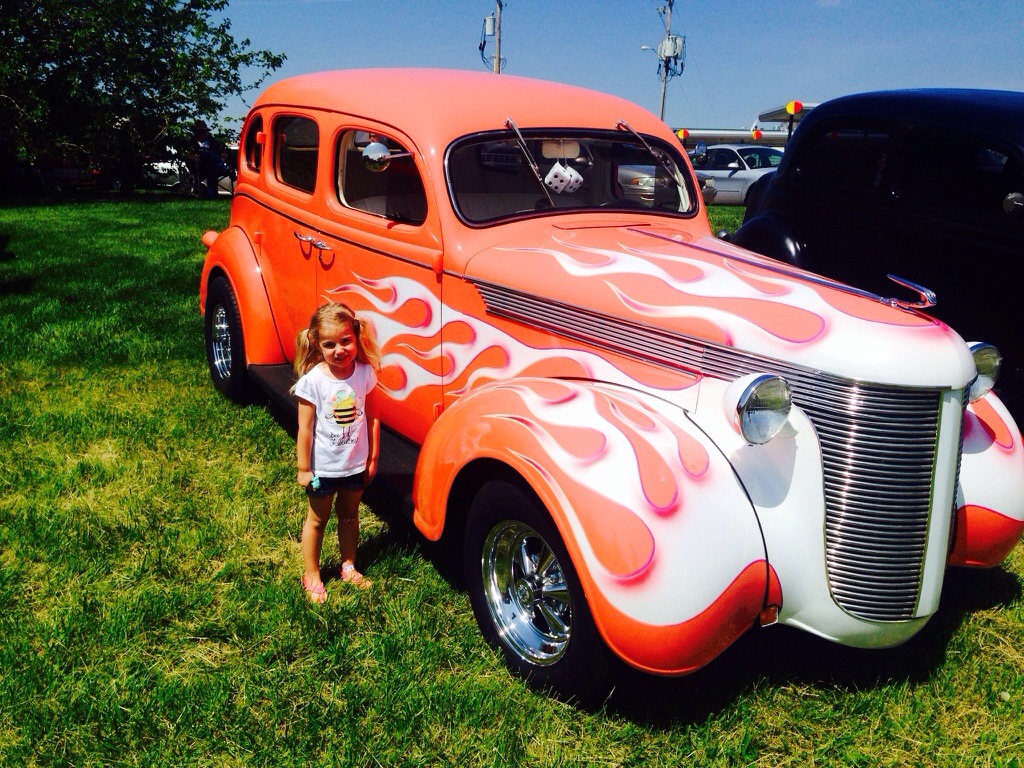 After breakfast, I saw that there was an open house at Pete and Jakes Hot Rod Shop. That shop is a pretty famous shop and builds really cool cars. The shop is only ten minutes from our house, and the owner is a member of our church. I’ve been to the shop before, but I’ve always missed the open house dates. Roz loves cars, so she was all for it. We cruised over and it was packed, there were tons of awesome cars to check out. On the way there, we talked about and thought of all the different colored cars we might see. Of course, Roz wanted to see a pink car, but she also wanted to see an orange car too.