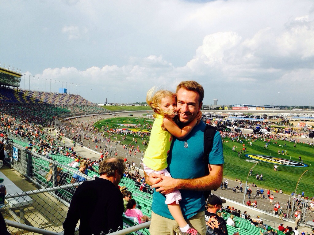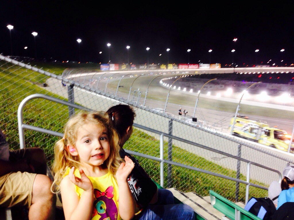 Megan left in the morning to go garage sale shopping with some girls. Me and Roz got up and I didn’t really have plans for us until that night. We were going to the Sprint Cup NASCAR race at Kansas Speedway. I used to be all into NASCAR and watched all the races, but the past two years, we haven’t had TV, so I really haven’t followed it. I also had never been to a live race, so I was excited to go. Roz was excited too, she loves anything loud and fast, plus she loves cars and racing, so she was excited. She didn’t really know what to expect, but I told her is was gonna be like the movie “Cars”.