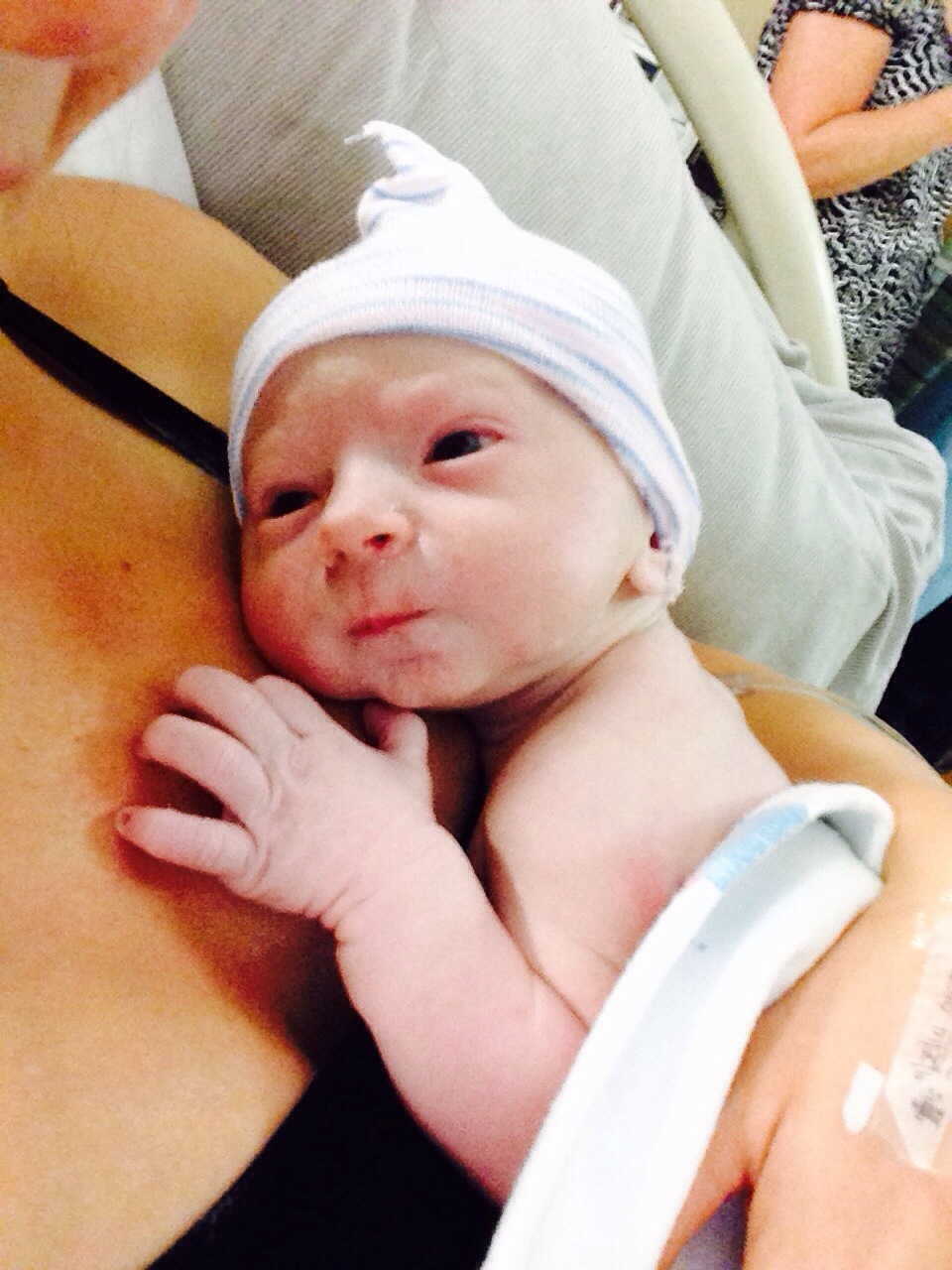As soon as the tires hit the tarmac, I turned on my phone. We were still on the runway and I was texting Megan, but I didn’t see she was typing back, so I decided to call. Her friend Shannon answered, but she was quiet, then after a short pause, “here’s Megan”. “I just had him” she says, and I could even hear him crying. Our little guy was born just two minutes before I called, he was on Mommy’s chest and I was able to talk to him and hear him. He was finally here and he was healthy! I was soooooooooo happy and excited, my sadness was all gone, and I didn’t even think about the fact that I missed his birth. Then Megan says, “do you want a picture of him”?
