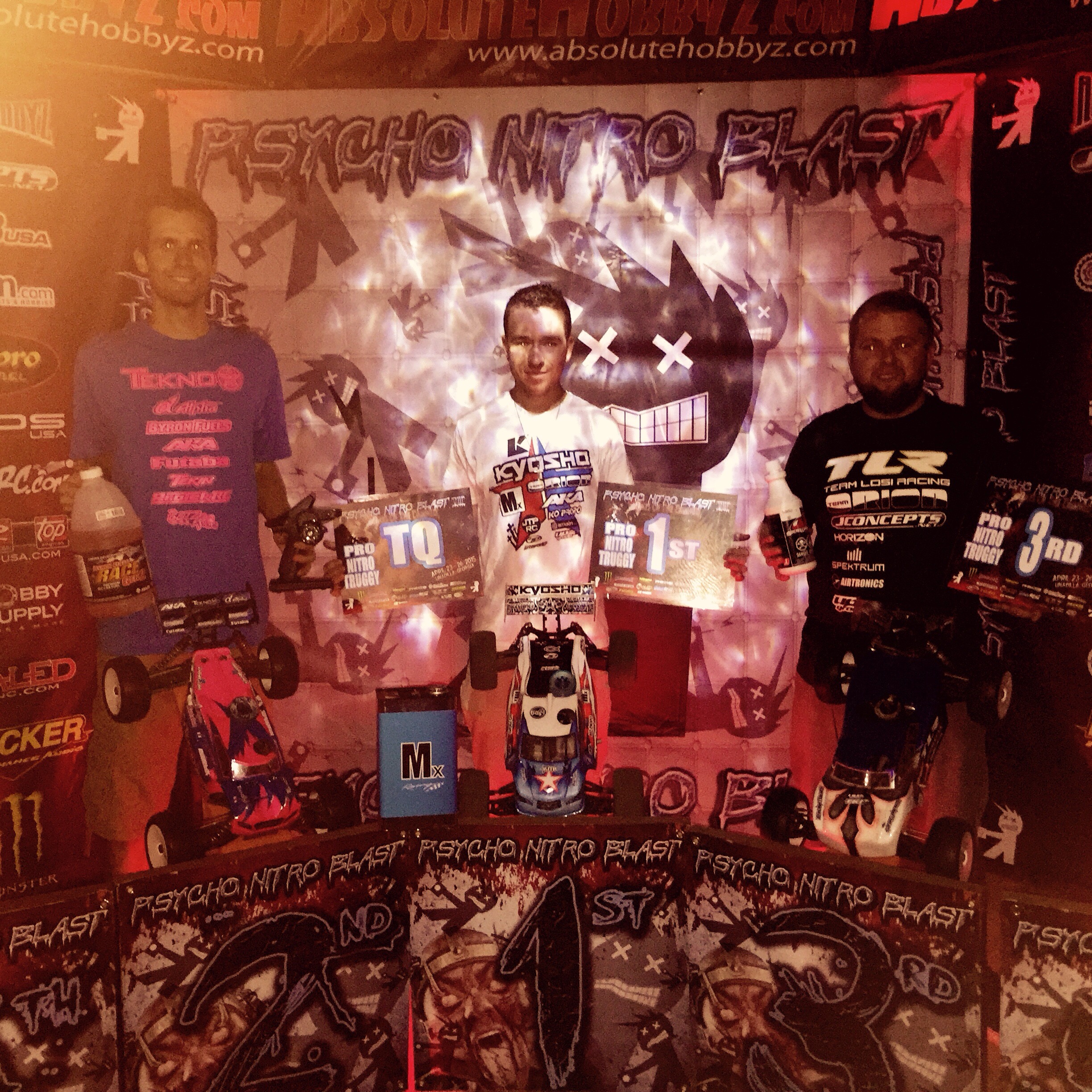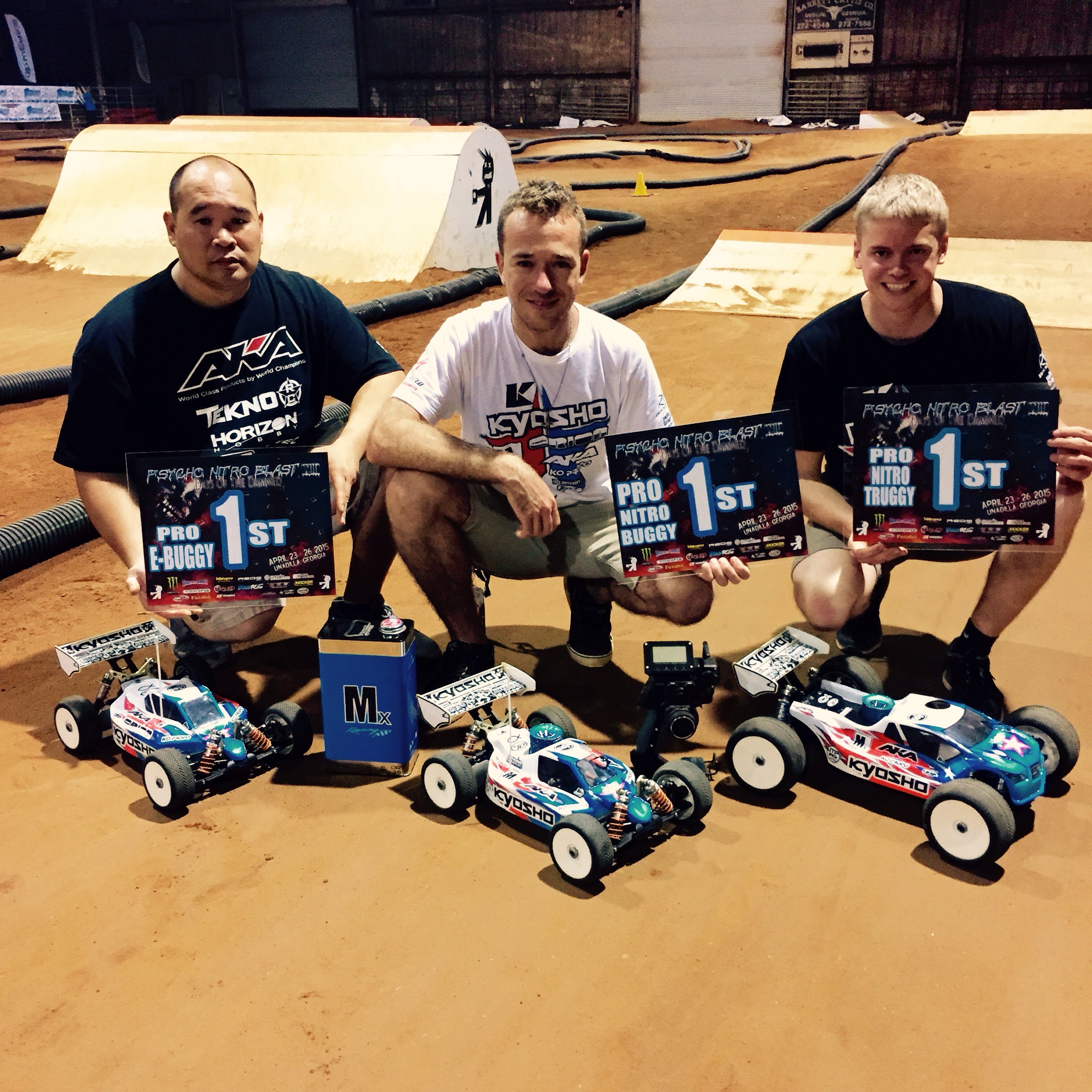 The final race of the 2015 Psycho Nitro Blast was 1/8 Nitro Pro Buggy! I was starting 2nd, behind Maifield, but I was determined to get the full sweep. In the practice before the start of the main, my car was feeling great, so I was ready to battle. The tone went off, and we were racing. It was a good start and I was close to Maifield on the first few laps, but then a mistake would drop me back to 4th, and put me around 7 seconds back of the lead. I still felt confident, as I knew the track was gnarly, and mistakes were going to happen, I needed to focus and let the lead come back to me. I found my groove and started to reel in Maifield for the lead. I was able to get the lead after the first pit stop and then pulled a little lead after that. I would hold a 5 – 10 second lead for most of the race, but then it would get closer at the end. Maifield was pushing hard, and I got a little out of my groove with the difficult conditions. The race was only between us too, as we were a full lap ahead of 3rd, and 2 full laps ahead of 4th. We were both pitting at 9 minutes and both pit crews were similar in pit times, so it was just between us on the track to fight it out. In the final 10 minutes, Maifield got right behind after I made a costly mistake and crashed when I hit a HUGE braking bump in the center of the track. We was within 2 seconds of me for a while and we were matching laps and matching small mistakes. Who could find the edge the drive the closest to that edge, that was the game at the end of the race. I found my groove again and just tried to drive my own laps and not think about anything else. On the last lap, the lead was 3 seconds, but Maifield was pushing hard, too hard, and crashed. I drove around safe the final lap and took the win, making it 3 for 3 on the weekend!