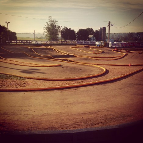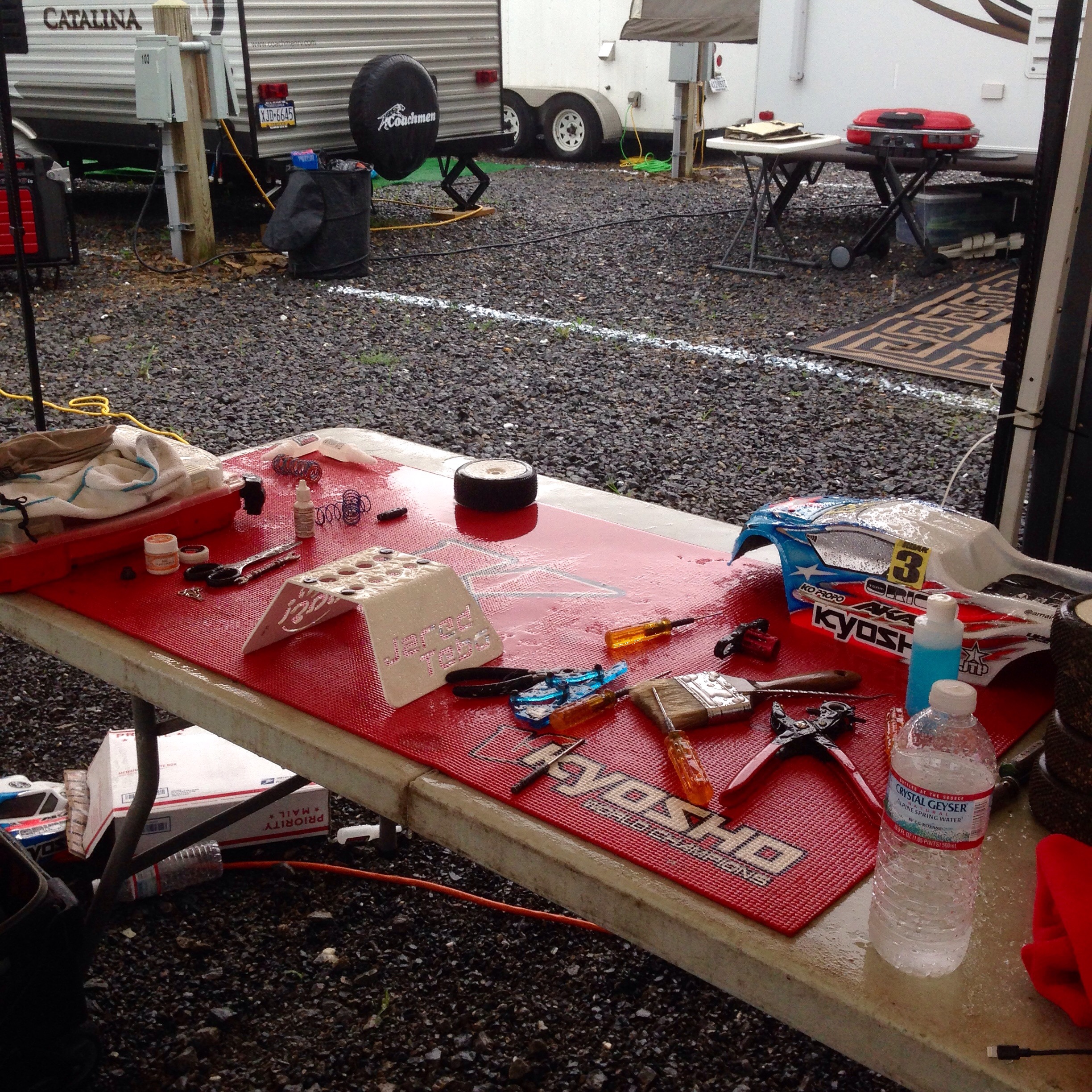 I’m headed out to PA for the 2015 ROAR 1/8 Electric Nationals held at LCRC Raceway. I will be racing both Electric Buggy with my Kyosho MP9e TKI and Electric Truggy with my Kyosho STRR Evo2 electric conversion. Joe and I fly into Philly, then we are on the road for 2.5 hours deep into the windy roads and beautiful hill country of Pennsylvania. We are treated with tons of on and off rain showers for the entire drive. As we drive by the exit for the track, there is a total downpour going on, about 20 minutes later, we arrive at our hotel. Practice is starting the next morning, but I was thinking the track would be totally under water.