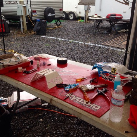 Thursday Practice is here, and to my surprise, the track is looking great as soon as we get there. We had two rounds of seeding practice with each car. Track started out a little green with the rain, but quickly came in and was feeling pretty good. I had been to the track back in 2012, but the dirt had changed a little from what I had been told. My cars were feeling ok, and I was getting the feel of the track layout pretty quick. I was trying to get more speed out of me or my cars, the day was going similar to how practice went in Chico, CA for the Nitro Nationals. My cars felt decent, and I was driving decent, but my lap times were way off pace to where I would normally be. We got both seeding runs for truggy, but before I got to run my second practice with buggy, major down pour and we were done for the day.