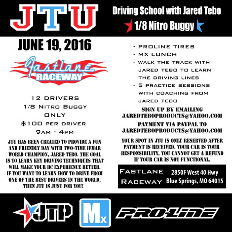 I am having a 1/8 Nitro Buggy JTU at Fastlane Raceway in Blue Springs, MO on Sunday, June 19, 2016. The class is open to 12 drivers, you will get 5 practice sessions with personal coaching from Jared Tebo. A very detailed track walk and 2 driving demonstrations by Jared Tebo. The class is $100 and you get a set of 4 Proline Tires, 4 Proline Foams, and lunch. Sign up via PayPal and email to jaredteboproducts@yahoo.com