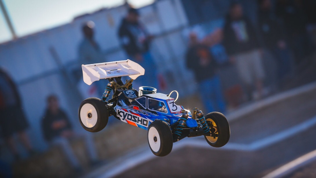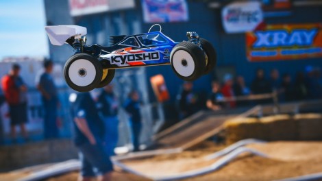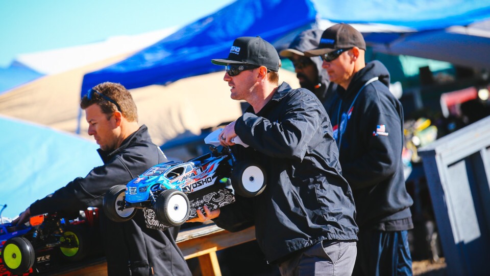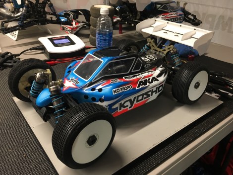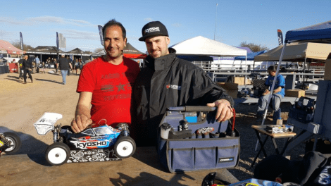 Saturday was the Main day for eBuggy and Truggy. Around 1pm we had our A-Main practice sessions. I wanted to try the Typo’s again in ebuggy so that’s what I started on. The practice was during the sunny part of the day and our A-Main would be later in the evening, so the track would be different. The Typo’s felt too soft and not that great, so I switched to AKA Super Soft DoubleDown and was feeling much better. I was just trying to focus on clean laps and not making mistakes, that was going to be KEY for the rest of the event. Truggy practice went good as well and I was mentally ready for the mains. I also had some new pit help as Joe Pillars went home. Some great Kyosho teammates, Ofir Komerian from Jersey, and Ben Sterling from Australia stepped in and helped. We did two practice stops in the warm up …. all was feeling good.