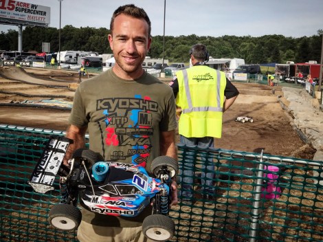 1 hour Buggy Final : My warm up was pretty bad, my car seemed to be struggling in the tough sections, and I crashed a ton of times. I also came into the pit 3 separate times for small ride height adjustments trying to get my balance better. Warm up was over, we were lined up on the back straight, and I wasn’t sure how I was feeling about my car. Starting 6th, my main focus was to stay clean, and try to miss any pile ups that happened in front. The tone sounded and we were off, I made it through the front jump section and then there was contact already in front of me. I made one pass, maybe two. A few laps in Cole Ogden made his way towards the front, we were 2nd and 3rd with Tessman leading. Tessman crashed off the dragons back I think, Ogden took over the lead and started to check out. This was around 5 minutes in or so, and I wasn’t really feeling it yet, still making some mistakes and the lead group of cars were getting away from me. Maifield, who had a bad start, caught me and got around me, which put me around 5th, behind Ogden, Tessman, Cavalieri, and Maifield. After the first pit stop, I started feeling much better and stopped crashing, getting into a good flow around the track. Maifield had a crash, and then the marshal fell down trying to get his car, and then he had a bigger issue that dropped him out of the race. Short after that, Tessman had radio issues with him losing his signal and having to go into the pits. I had also passed Cavalieri on track and worked on catching Odgen in the lead around the 15 minute mark of the 60 minute Final. Ogden crashed off the dragons back and I took over the lead! In my head I couldn’t believe it, after the first 5 minutes, I thought I was out of it and had no chance, now I’m leading. Cavalieri was now in 2nd and we had a great battle for quite a while, swapping the lead multiple times with small little mistakes here and there. The whoop section, dragons back, and berm roller sections were the critical sections of the track where time was really lost or gained. Behind Cavalieri and I, Rivkin and Lutz were finding their pace also and worked past Ogden to run 3rd and 4th. I had started the race wearing my motocross goggles to protect my eyes from the dust, but about 25 minutes into the Final, my face started to sweat pretty bad, especially my eye brows. I wasn’t really sure how to fix the issue, but I was worried if I took my goggles off, it would be very difficult for my eyes to adjust while still driving. During my next pit stop, I grabbed my goggles and pulled them into my face and used the foam to wipe my eye brows. It seemed to work pretty good and I didn’t have sweat running into my eyes. On track, I had a 10 or so second lead on Cavalieri and Rivkin in 2nd and 3rd. Just a few minutes later, right around the halfway point, my face was sweating again, and now I had a sweat drop right in the middle of my lens. The lens were also starting to fog, it was just a total mess. I yelled down to joe Pillars to come up onto the driver’s stand. He came up, “I need you to take my goggles off, wait for the straight” I told him. Going down the back straight, he pulled them off and it was a pretty big shock on my vision, but I was really happy to just have them off and have better vision after my eyes adjusted. I didn’t crash at all through that big mess, and I went back to focusing on the job. Cavalieri had dropped back quite a bit after many mistakes, and with 20 minutes or so remaining, I caught him to put him a lap down. I wanted to stay behind him and just follow behind as he had great pace and it took my mind off the cars that were in 2nd and 3rd, Lutz and Rivkin. unfortunately Cavalieri bobbled on the dragons back and I ran right into him and I crashed. With 15 minutes remaining, I had a decent lead on Lutz in 2nd, around 10-15 seconds as it could fluctuate a few seconds each way after every lap. Get a good line through the whoops, land clean on the dragons back … gain 2 seconds. Go an inch wide into the berm, hit 3 MONSTER holes … lose 2 seconds, the front jump section and roller after it was also similar, do it good, gain a couple seconds, not do it super clean, lose a couple seconds. You could easily have a 4 second gain or loss and nobody even crash. My Kyosho MP9 TKI4 was still feeling really good, shocks were still performing how they should, they weren’t overheating like they did in the Semi. Also my MX engine from my Truggy was still running perfect, and my choice of AKA SLW Impacts seemed to be the perfect tire for the Final. The final 10 minutes I would again catch Cavalieri, but this time he was battling with Rivkin for 3rd. I also caught Ogden who was running 5th a couple of laps down to me, but all these drivers had really good pace still. That makes it hard when your trying to drive your own race, your own lines, as we were all similar in lap times. They were all really respectful of me, trying to give me as much room as possible, but it was still challenging and not a position I wanted to be in. Lutz started to catch me and then my mind starting to wonder … ” I’ve had a good race, I’d be happy with 2nd ” I thought to myself. WHAT!!!! I snapped out of that mindset, ” No, winning is the only thing that I will accept, I CAN WIN” I yelled at myself in my head. With 5 minutes to go, traffic had slowed me down, getting some bad lines here and there had slowed me down, and Lutz was only 2 or 3 seconds behind me. The next lap after he got pretty close, Lutz crashed off the dragons back and was into the hay bale. I focused on myself and tried my hardest to pretend that I was out at Fastlane Raceway burning laps all by myself and loving every minute of it. The track was super challenging, but also very fun to drive when you could hit all the sections clean. I wanted to enjoy every lap of the track and every minute of the race. My final 5 minutes were driven good, I stretched out my lead back to 10 secon